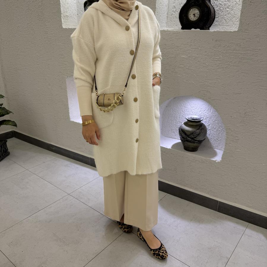 Angora ipten dokumadır 36/46 beden aralığındadır 92cm uzunluğundadır İlikli düğme şeklindedir